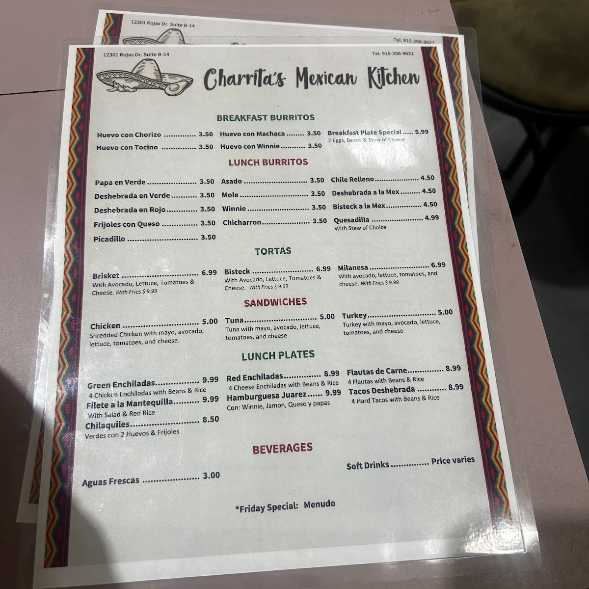 Welcome to Charrita's Mexican Kitchen, a delightful gem nestled in El Paso, Texas. This cozy Mexican restaurant prides itself on serving authentic dishes that resonate with homemade flavors. Their lunch menu is a feast, featuring tantalizing burritos such as the Bisteck A La Mex and Deshebrada En Verde, each priced affordably around $4.00 to $4.50. The tortas and sandwiches, including hearty options like Bisteck with Avocado and Shredded Chicken, add variety to the experience, all offered at reasonable prices.